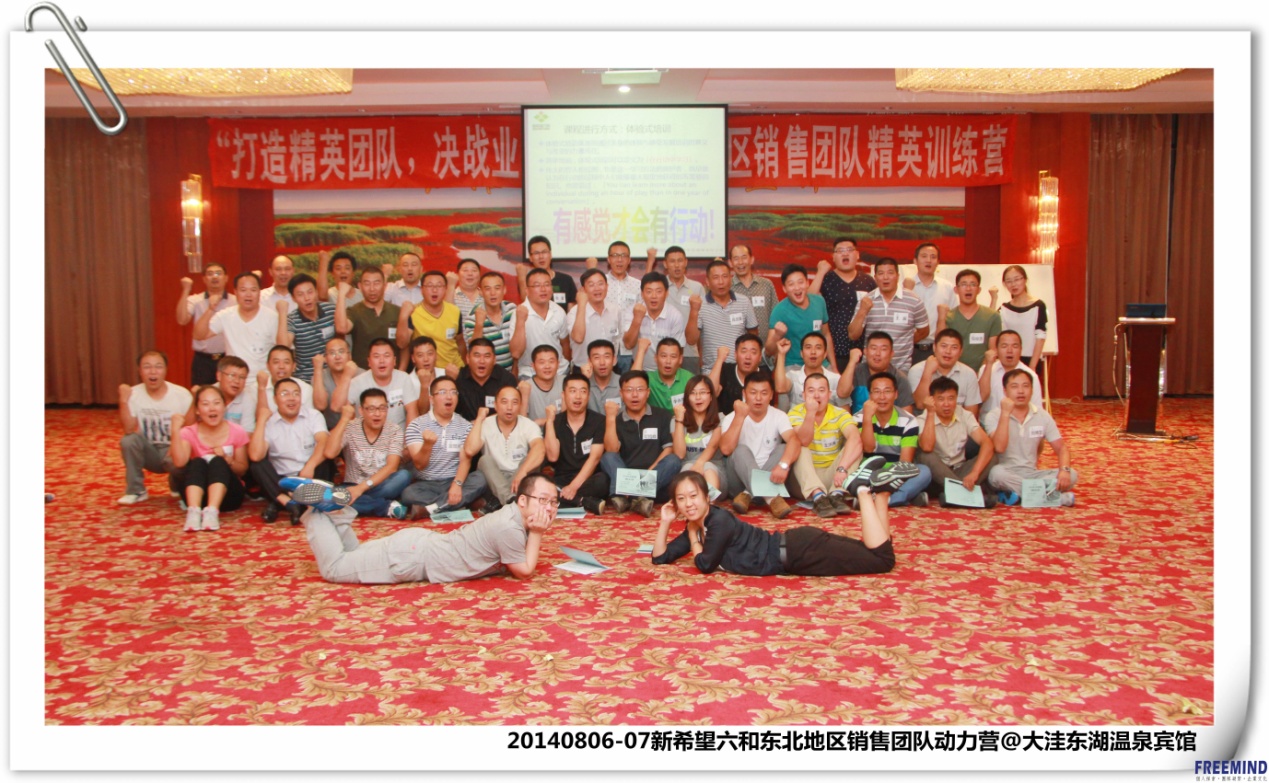 2014年8月6~7日新希望六和东北地区销售团队精英训练营在辽宁盘锦大洼东湖温泉宾馆正式开训。一天一夜的体验式课程,彼此怀揣理想和目标,接受未知的挑战,期待更多的成长。